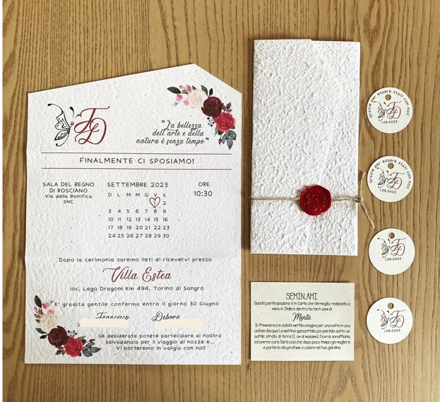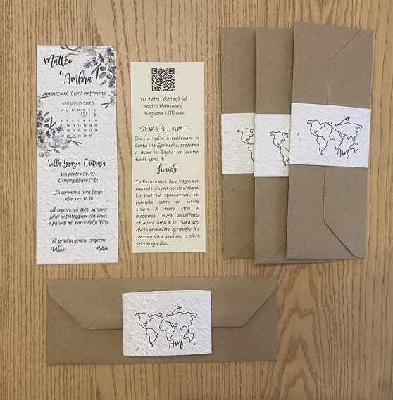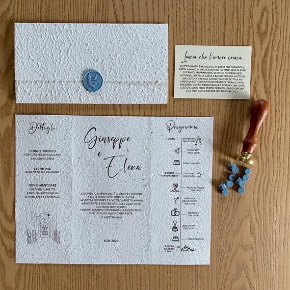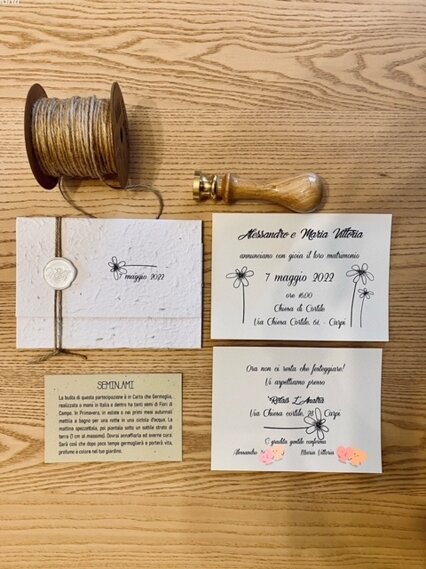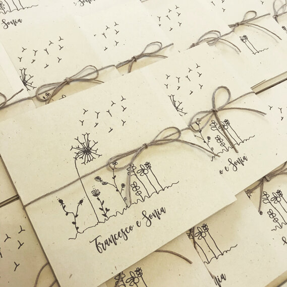 Scegli la nostra linea SEMINCARTA realizzata con carta piantabile che germoglia per dare un significato ancora più profondo e unico al tuo matrimonio. I semi contenuti nella carta si trasformeranno in fiori o erbe aromatiche e puoi scegliere quelli che preferisci!